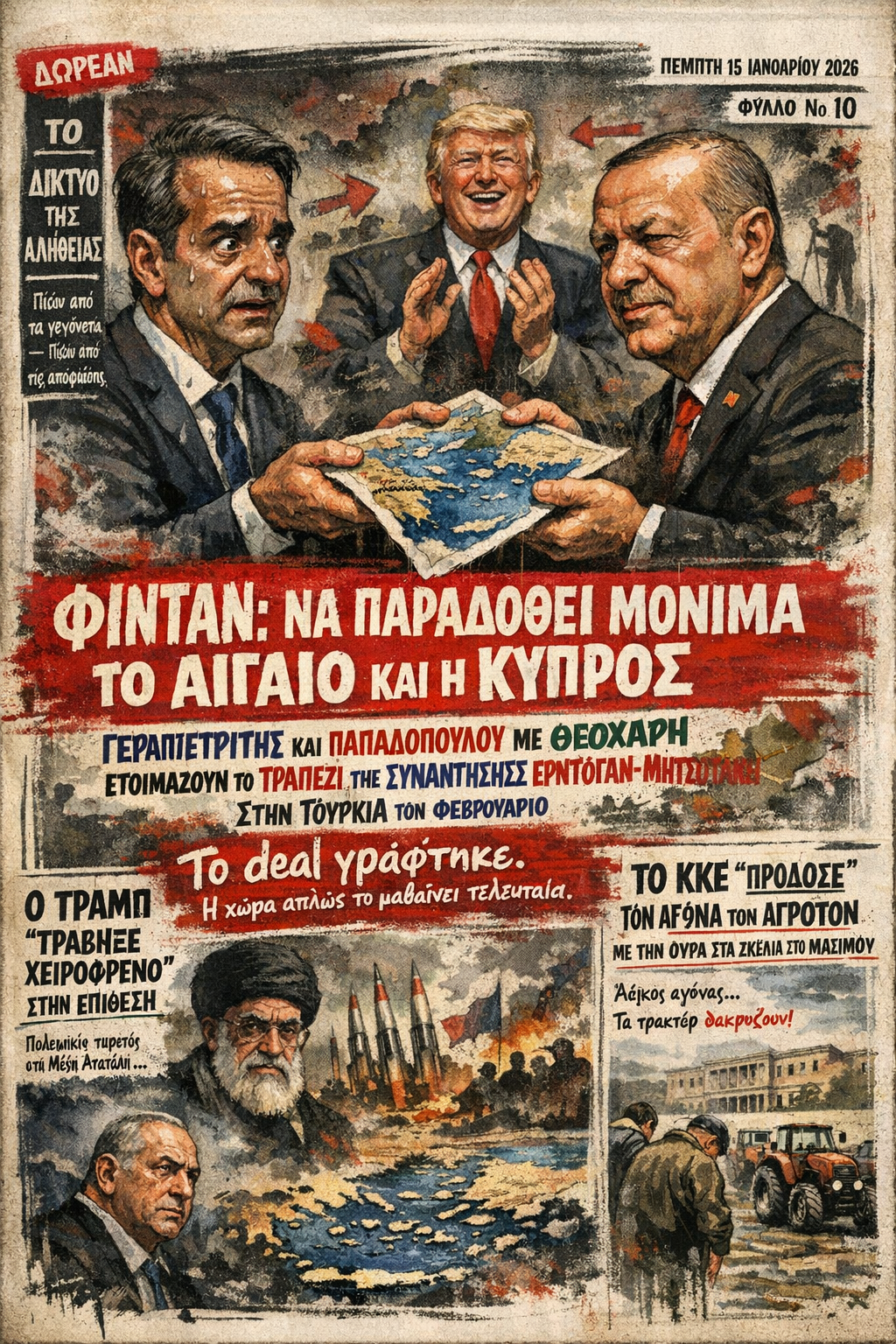 Η δήλωση Φιντάν για μόνιμη “παράδοση” Αιγαίου και Κύπρου φέρνει στο προσκήνιο υπόγειες διαπραγματεύσεις και διεθνή παιχνίδια ισχύος. Την ίδια στιγμή, η Μέση Ανατολή ακροβατεί στον πόλεμο, ενώ στην Ελλάδα ο αγροτικός αγώνας λήγει χωρίς αποτέλεσμα. Τρία μέτωπα, ένα κοινό μοτίβο: αποφάσεις πάνω από κοινωνίες και χώρες.