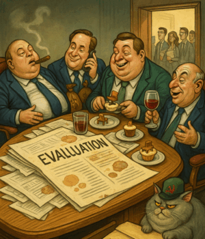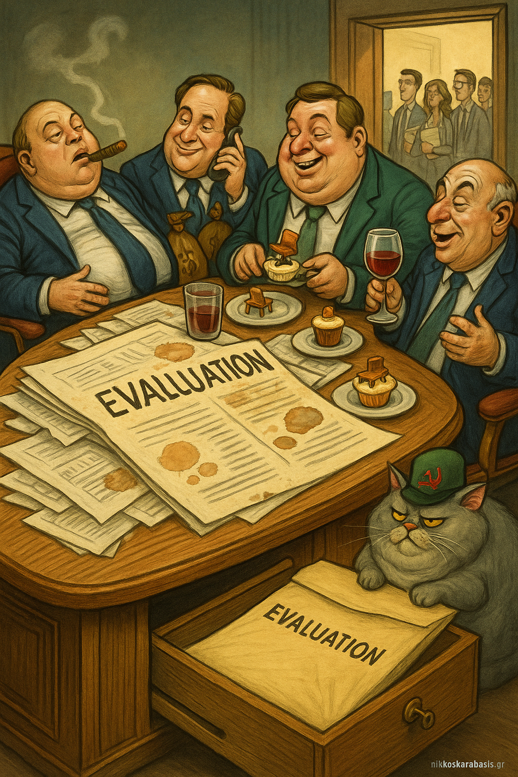 Στο πλάι, ένας μεγάλος σφραγισμένος φάκελος που γράφει «Αξιολόγηση» κλειδωμένος σε συρτάρι, ενώ από πάνω του κάθεται μια χοντρή γάτα με κομματικό καπέλο.