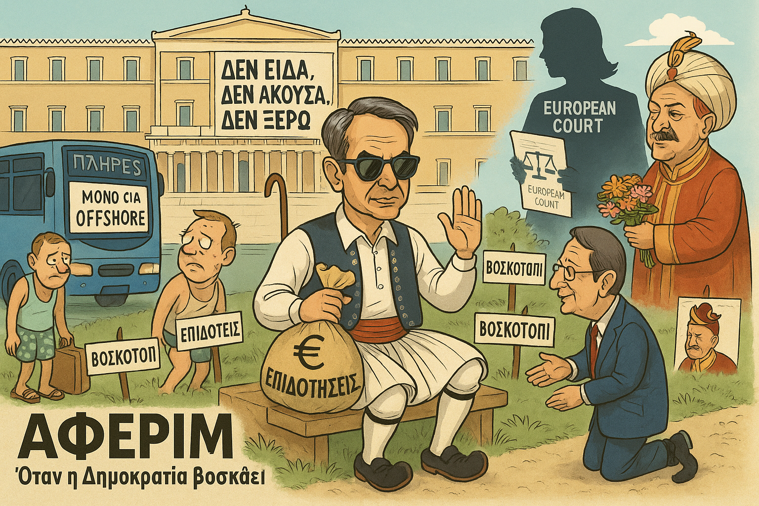 Η αντιπολίτευση; Στην Ελλάδα παίζει “χαλαρή αντι-παράσταση”, κι από ουσία, μηδέν. Μια φορά μιλάνε, δέκα φορές σιωπούν. Και δεν λένε τίποτα, επι της ουσίας. Στην Κύπρο; Ο πρόεδρός τους…παρακαλάει τον Ερντογάν να τον δεχτεί ως Σουλτάνο στη Λευκωσία, να του ζητήσει συγγνώμη επειδή οι Κύπριοι τόλμησαν να αντισταθούν στους Αττίλες. Λάθος τους. Έπρεπε να τους ρίξουν λουλούδια, όχι σφαίρες.