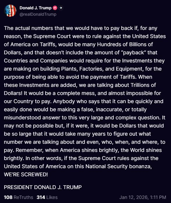 Ο Τραμπ παραδέχεται ότι μια αρνητική απόφαση θα μπορούσε να υποχρεώσει τις Ηνωμένες Πολιτείες να επιστρέψουν εκατοντάδες δισεκατομμύρια — ίσως και τρισεκατομμύρια — δολάρια, όχι μόνο σε κρατικό επίπεδο, αλλά και σε επιχειρήσεις που επένδυσαν για να παρακάμψουν τους δασμούς.
