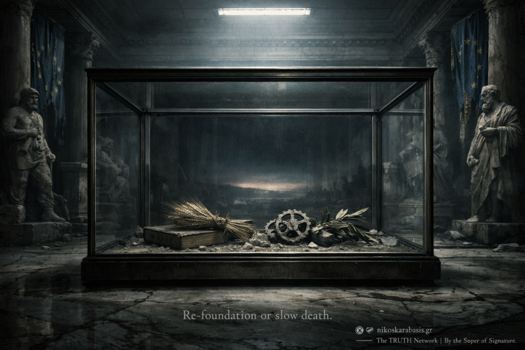 Το δίλημμα πλέον είναι αμείλικτο: Επανίδρυση ή Αργός Θάνατος; Αν η ΕΕ δεν επιστρέψει στις ρίζες της, σε μια Ευρώπη των Πατρίδων που σέβεται την παραγωγή, τον πολιτισμό και την κυριαρχία των μελών της, θα καταλήξει να είναι ένα «μουσείο»: ένα πλούσιο κέλυφος χωρίς ψυχή και χωρίς ισχύ.
