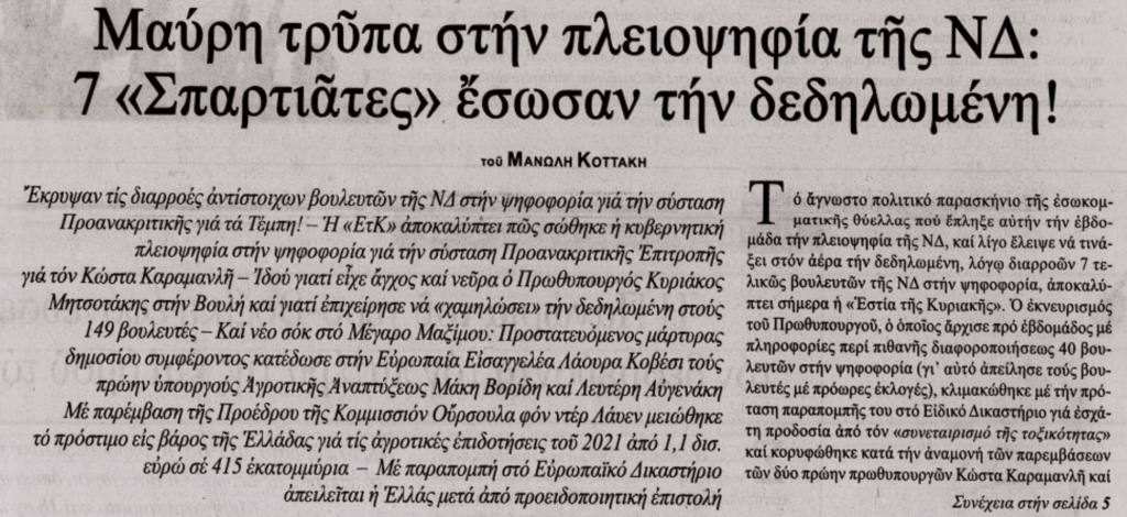 Η πολιτική σταθερότητα της κυβέρνησης Μητσοτάκη δέχεται ισχυρούς κραδασμούς, καθώς η εφημερίδα Εστία αποκάλυψε ότι στη μυστική ψηφοφορία για την προανακριτική επιτροπή σχετικά με την υπόθεση των Τεμπών, επτά βουλευτές της ΝΔ γύρισαν την πλάτη στον αρχηγό τους. Παρά τη διαρροή, η εικόνα της συνοχής διασώθηκε με τη βοήθεια των βουλευτών του κόμματος των Σπαρτιατών, οι οποίοι λειτούργησαν ως “ρεζέρβα” ψήφων — κατ’ εντολή, όπως φαίνεται, του Μαξίμου.