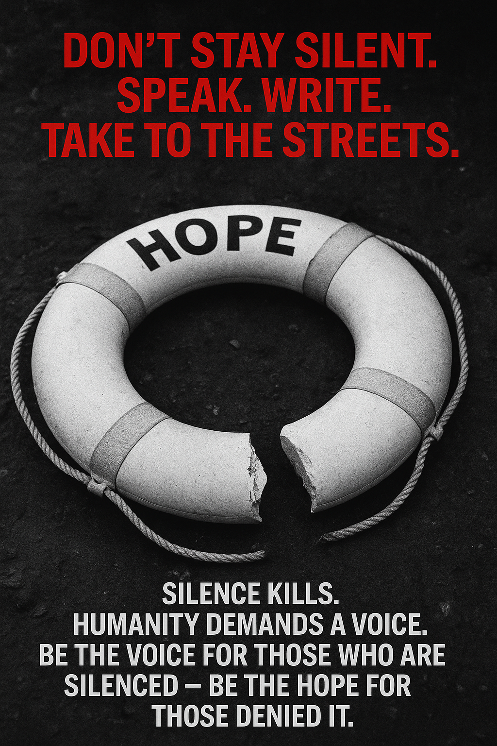 🔴 Don’t stay silent. Speak. Write. Take to the streets. Silence kills. Humanity demands a voice. Be the voice for those who are silenced — be the hope for those denied it.