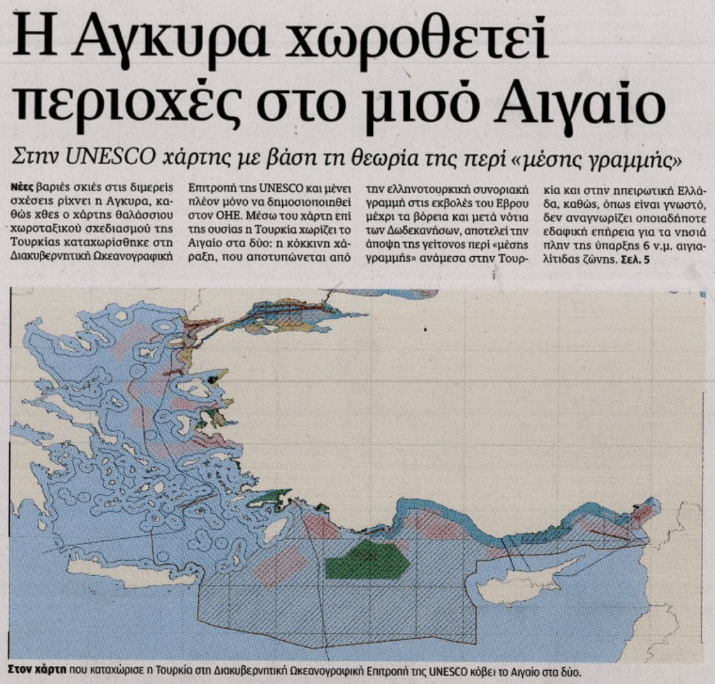 Δύο μήνες μετά την ανεκδιήγητη κίνηση της ελληνικής κυβέρνησης να αποστείλει στην UNESCO τον δικό της θαλάσσιο χωροταξικό σχεδιασμό — δίνοντας έτσι άλλοθι στην Τουρκία να εμφανίσει ως ισότιμη “διαφορά” την επιθετική αναθεώρησή της — η Άγκυρα, διά του Πανεπιστημίου της, κοινοποίησε και επισήμως τη δική της εκδοχή: