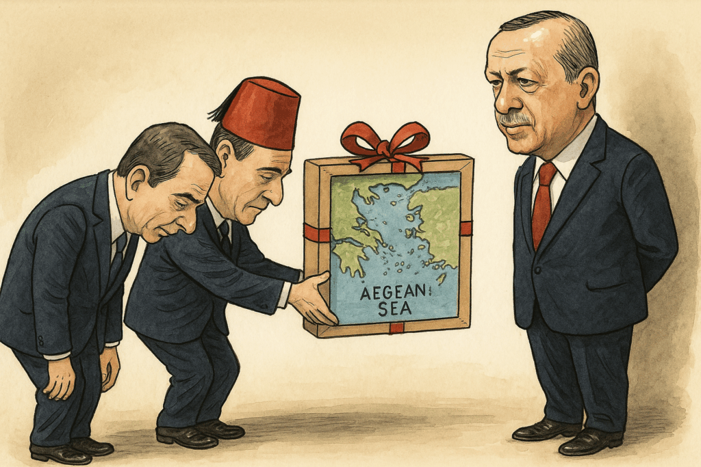 Gerapetritis, invoking outdated PASOK diplomacy, proposes to shelve the Turkish-Libyan pact, like Papandreou did with the Cyprus issue in 1988. But he forgets the “mea culpa” that followed. Meanwhile, Energy Minister Papastavrou returns from Washington high on optimism but empty-handed—no commitments, no geopolitical leverage, just polite nods and warnings that fossil fuels remain crucial, unlike Athens’ fixation on renewables.