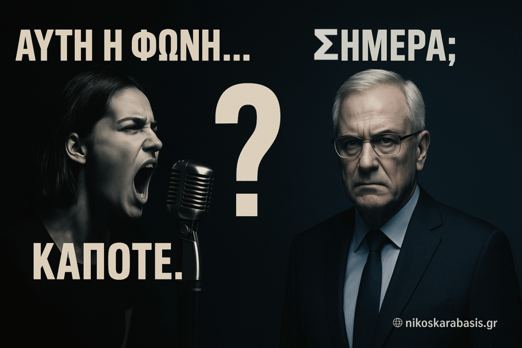 Η φωνή του Νοέμβρη του χίλια εννιακόσια εβδομήντα τρία. Πενήντα δύο χρόνια πριν. Η γυναικεία φωνή που έσπαγε το σκοτάδι της χούντας. Η φωνή του Πολυτεχνείου. Αυτή η φωνή…κάποτε. Σήμερα; Μια πολιτική φιγούρα που κινείται στα σαλόνια των Βρυξελλών.