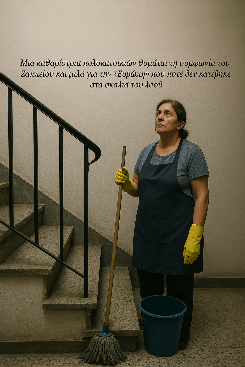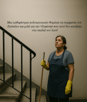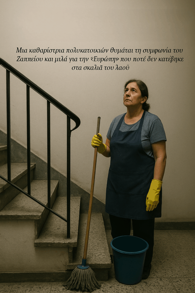 Μια καθαρίστρια πολυκατοικιών θυμάται τη συμφωνία του Ζαππείου και μιλά για την «Ευρώπη» που ποτέ δεν κατέβηκε στα σκαλιά του λαού.