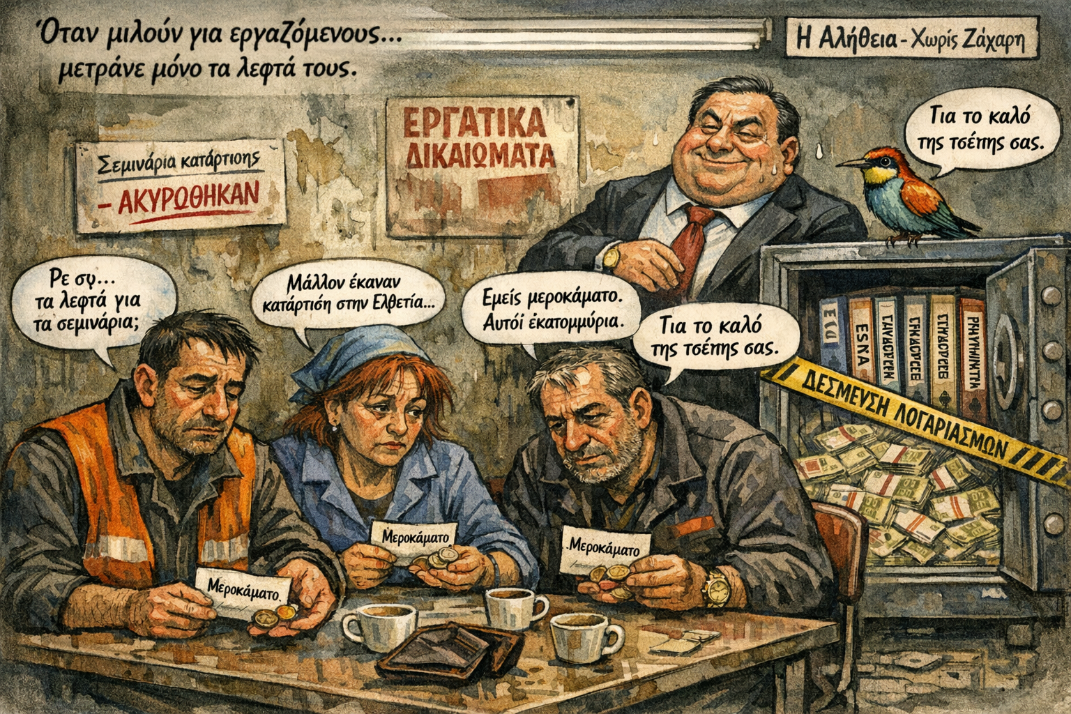 🚨 Εργατοπατέρες. Όχι εργάτες. • Εβδομήντα τρία εκατομμύρια για «κατάρτιση» • Λογαριασμοί δεσμευμένοι • Σεμινάρια… εξαφανισμένα • Και ο εργαζόμενος; Με ψιλά στο χέρι 👉 Όταν οι συνδικαλιστές γίνονται επιχειρηματίες, 👉 το μεροκάματο γίνεται ανέκδοτο. Δεν ήταν εκπρόσωποι. Ήταν διαχειριστές ταμείου. Και το ταμείο… άδειο. Για εμάς. 🎭 Η Ελλάδα του μεροκάματου πληρώνει. 🎩 Η Ελλάδα των «προέδρων» γλεντά. Πόσοι ακόμα «εργατοπατέρες» χρειάζονται για να καταλάβουμε ότι το βαρέλι δεν έχει πάτο;