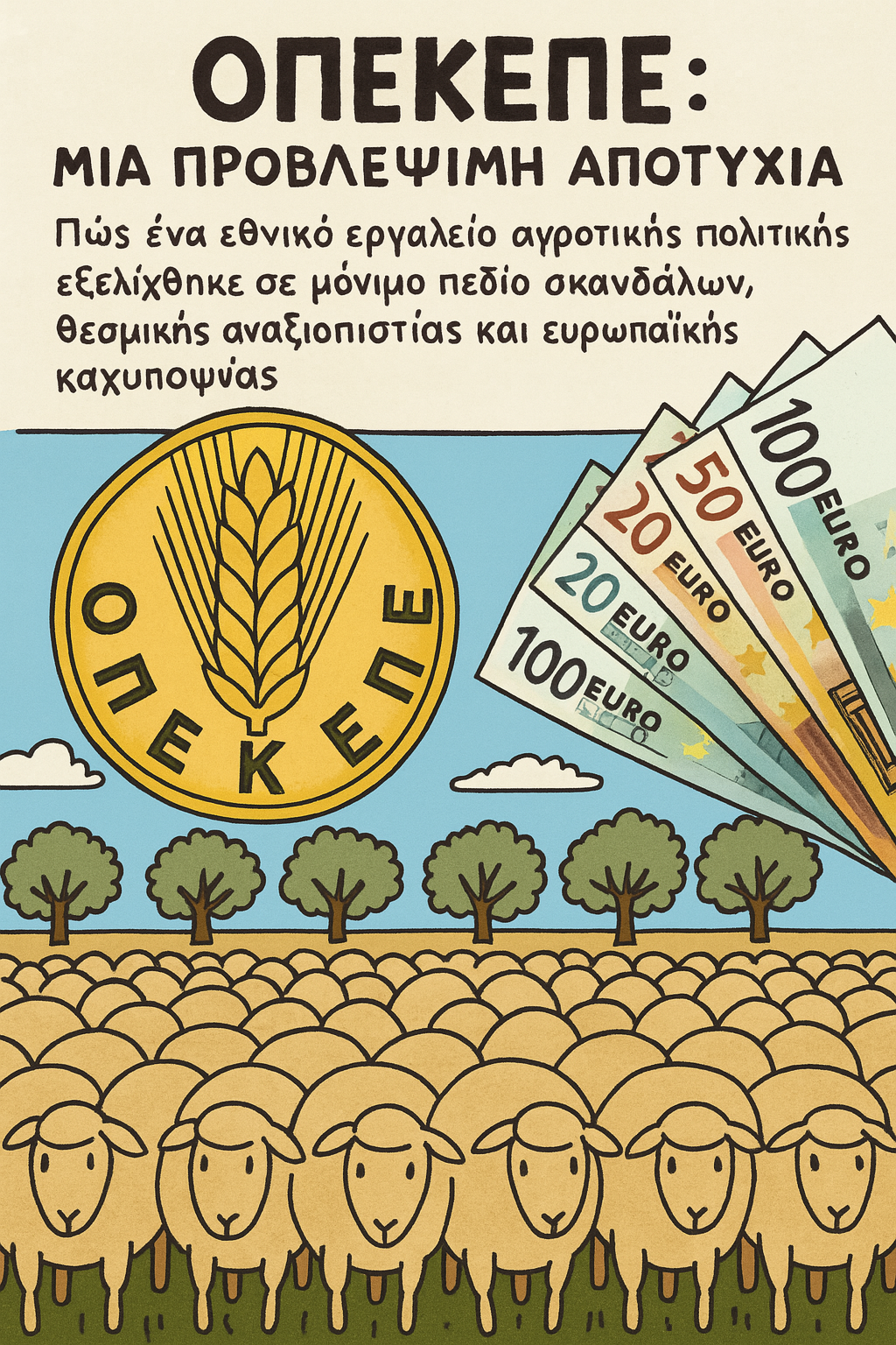 Ο Οργανισμός Πληρωμών και Ελέγχου Κοινοτικών Ενισχύσεων (ΟΠΕΚΕΠΕ), ιδρυμένος το 1998, είχε ως αποστολή τη διαχείριση των άμεσων ενισχύσεων προς τους Έλληνες αγρότες. Αντί να αποτελέσει τον πυλώνα διαφάνειας και αξιοπιστίας, κατέληξε να είναι η επιτομή της γραφειοκρατικής αναποτελεσματικότητας και της πολιτικής συνενοχής.