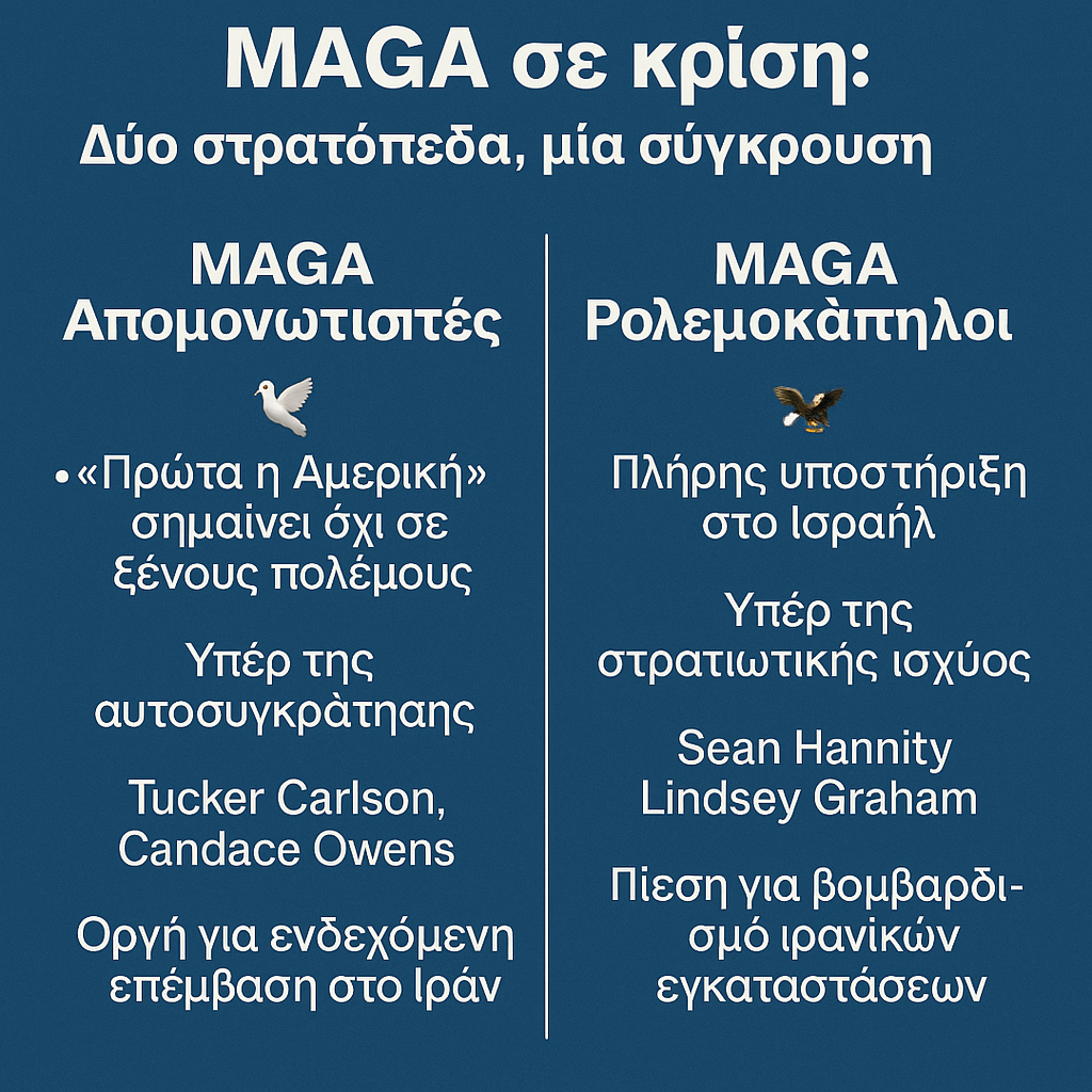 Η διχοτόμηση που αποτυπώθηκε στο infographic δεν είναι απλώς στρατηγική. Είναι ψυχική. Οι πρώην “αντιπολεμικοί” συντηρητικοί βλέπουν σήμερα να προδίδεται η ουσία του κινήματος. Αν ο Τραμπ διατάξει στρατιωτική εμπλοκή στο Ιράν, τότε το “America First” θα αποδειχθεί απλώς ένας μύθος προεκλογικής χρησιμότητας, χωρίς ρίζες και ιδεολογική συνέπεια.