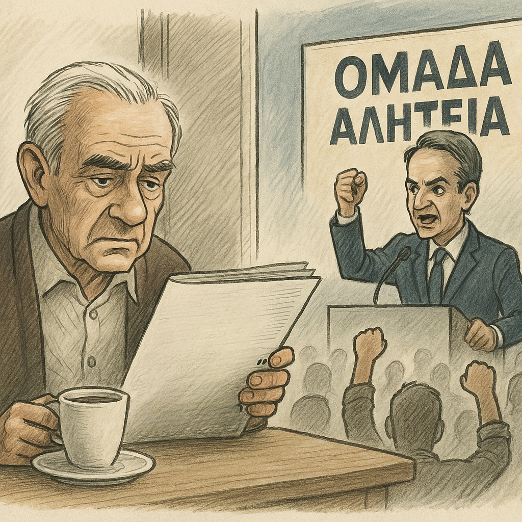 Κάθομαι στο καφενείο και διαβάζω τα νέα, και δεν μπορώ να μην νιώσω ένα σφίξιμο στο στομάχι. Όχι μόνο για το πώς κατάντησε αυτή η χώρα που αγάπησα και δούλεψα γι’ αυτή πενήντα χρόνια, αλλά και για το πώς η σημερινή εξουσία δεν κρατά ούτε τα προσχήματα. Η εκδήλωση της λεγόμενης «Ομάδας Αλήθειας» δεν ήταν απλώς μία κομματική συγκέντρωση. Ήταν μια δήλωση πρόθεσης. Ένας χάρτης πορείας για το πώς η κυβέρνηση του Κυριάκου Μητσοτάκη σκοπεύει να κινηθεί στο εξής: με σύγκρουση, με πόλωση, με τη γλώσσα των τρολ και όχι του θεσμικού λόγου.