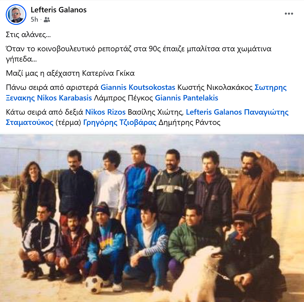 Στις αλάνες... Όταν το κοινοβουλευτικό ρεπορτάζ στα 90ς έπαιζε μπαλίτσα στα χωμάτινα γήπεδα... Μαζί μας η αξέχαστη Κατερίνα Γκίκα Πάνω σειρά από αριστερά Giannis Koutsokostas Κωστής Νικολακάκος Σωτηρης Ξενακης Nikos Karabasis Λάμπρος Πέγκος Giannis Pantelakis Κάτω σειρά από δεξιά Nikos Rizos Βασίλης Χιώτης, Lefteris Galanos Παναγιώτης Σταματούκος (τέρμα) Γρηγόρης Τζιοβάρας Δημήτρης Ράντος