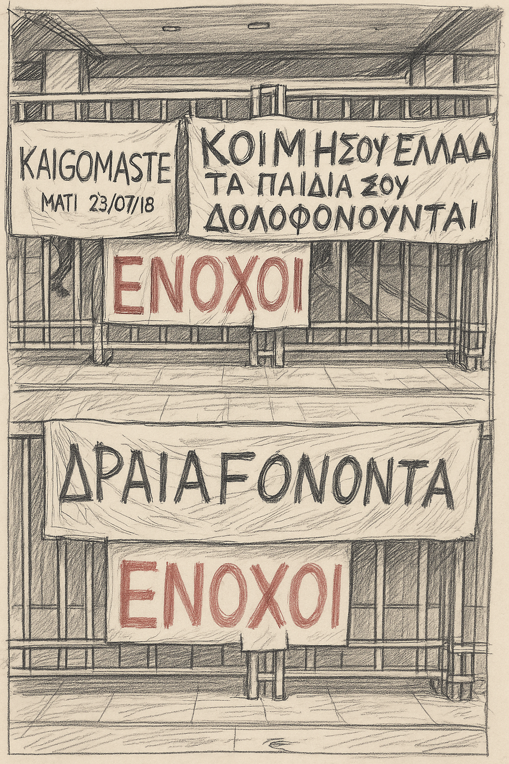 Greece relives once again the tragic drama of impunity. Former Attica Governor Rena Dourou, a politician who utterly failed in her duty, escaped punishment once more—not by chance, but through dark political deals and backroom bargains unknown to the public. She went to weep hypocritically over Palestinian children, while the Greek conscience knows full well that she and her administration have bloodied hands with the lives of the 102 souls burned alive.