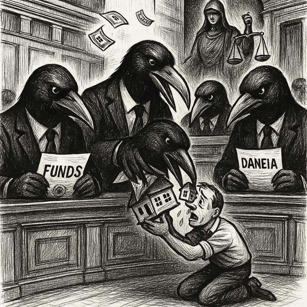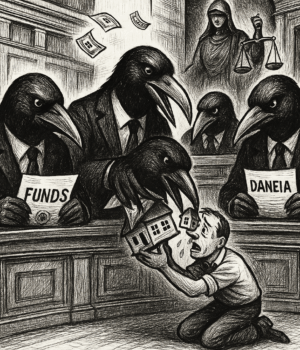 Μπροστά τους, ένας πολίτης γονατιστός, που του παίρνουν το σπίτι (συμβολικό σπίτι-κουκλόσπιτο που το τσιμπολογούν με τα ράμφη).