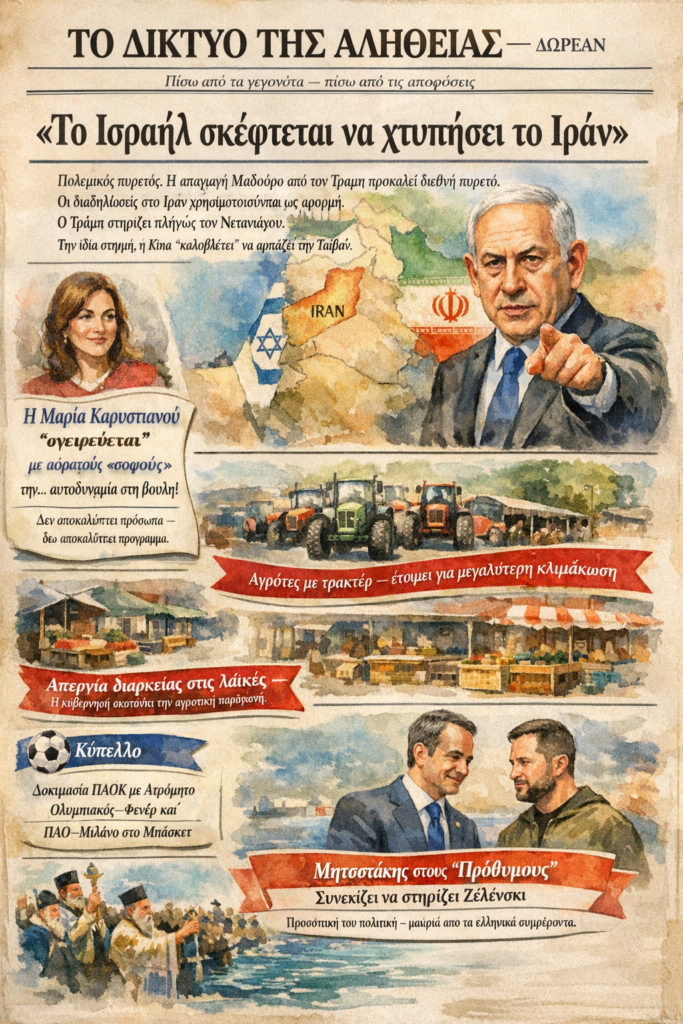 το Ισραήλ εξετάζει σοβαρά στρατιωτικό χτύπημα κατά του Ιράν, με τις Ηνωμένες Πολιτείες να εμφανίζονται πλήρως υποστηρικτικές. Οι διαδηλώσεις στο εσωτερικό του Ιράν αξιοποιούνται ως πρόσχημα, ενώ παράλληλα η Κίνα φαίνεται έτοιμη να εκμεταλλευτεί το κλίμα έντασης.