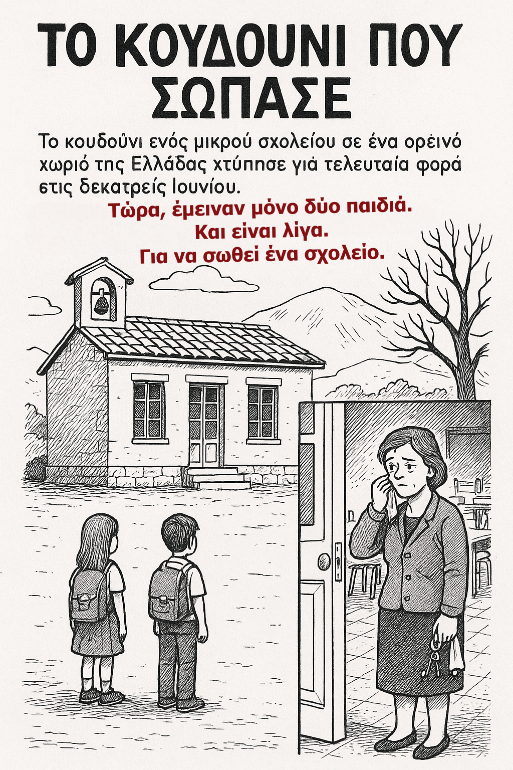 Το κουδούνι ενός μικρού δημοτικού σε ένα ορεινό χωριό της Ελλάδας, χτύπησε για τελευταία φορά στις δεκατρείς Ιουνίου.