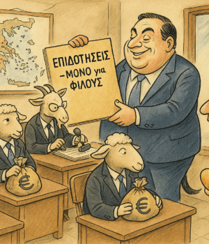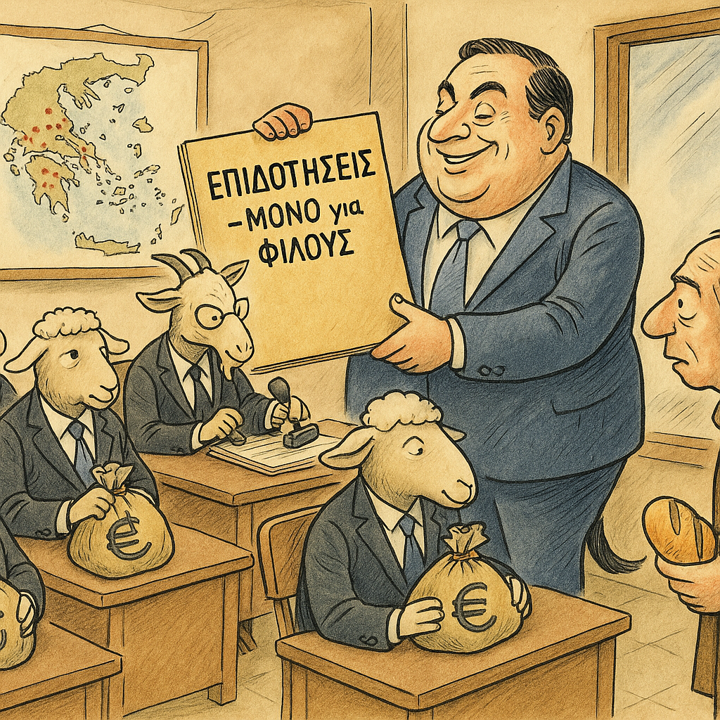 Ένα γελαστό πολιτικό πρόσωπο (καρικατούρα) κρατάει ένα τεράστιο σφραγισμένο φάκελο που γράφει «Επιδοτήσεις – ΜΟΝΟ για Φίλους».