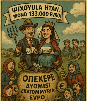 - Ένα banner στον ουρανό γράφει: “Ψίχουλα ήταν. Μόνο 133.000 ευρώ!”