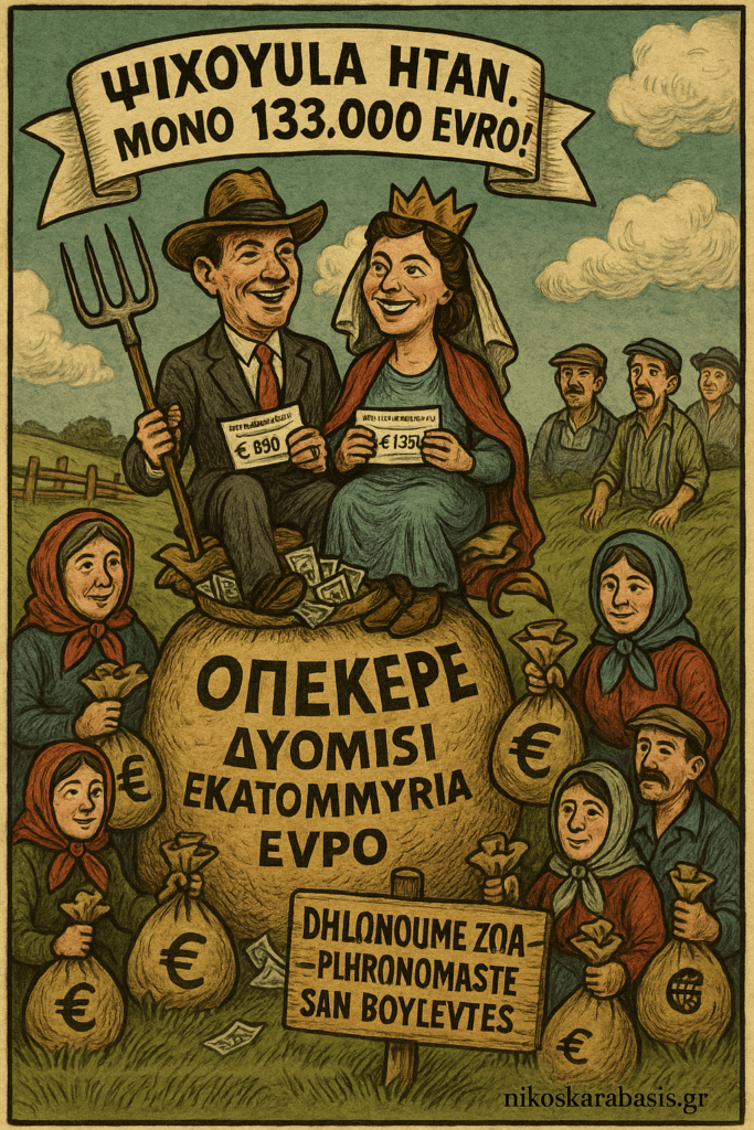 Και η κυρία Σεμερτζίδου —υποψήφια και συντονίστρια αγροτικών επιδοτήσεων της Νέας Δημοκρατίας— όταν ρωτήθηκε, απάντησε ότι τα εκατόν τριάντα τρία χιλιάδες ευρώ που έλαβε «δεν είναι και τίποτα»… Ψίχουλα, είπε.