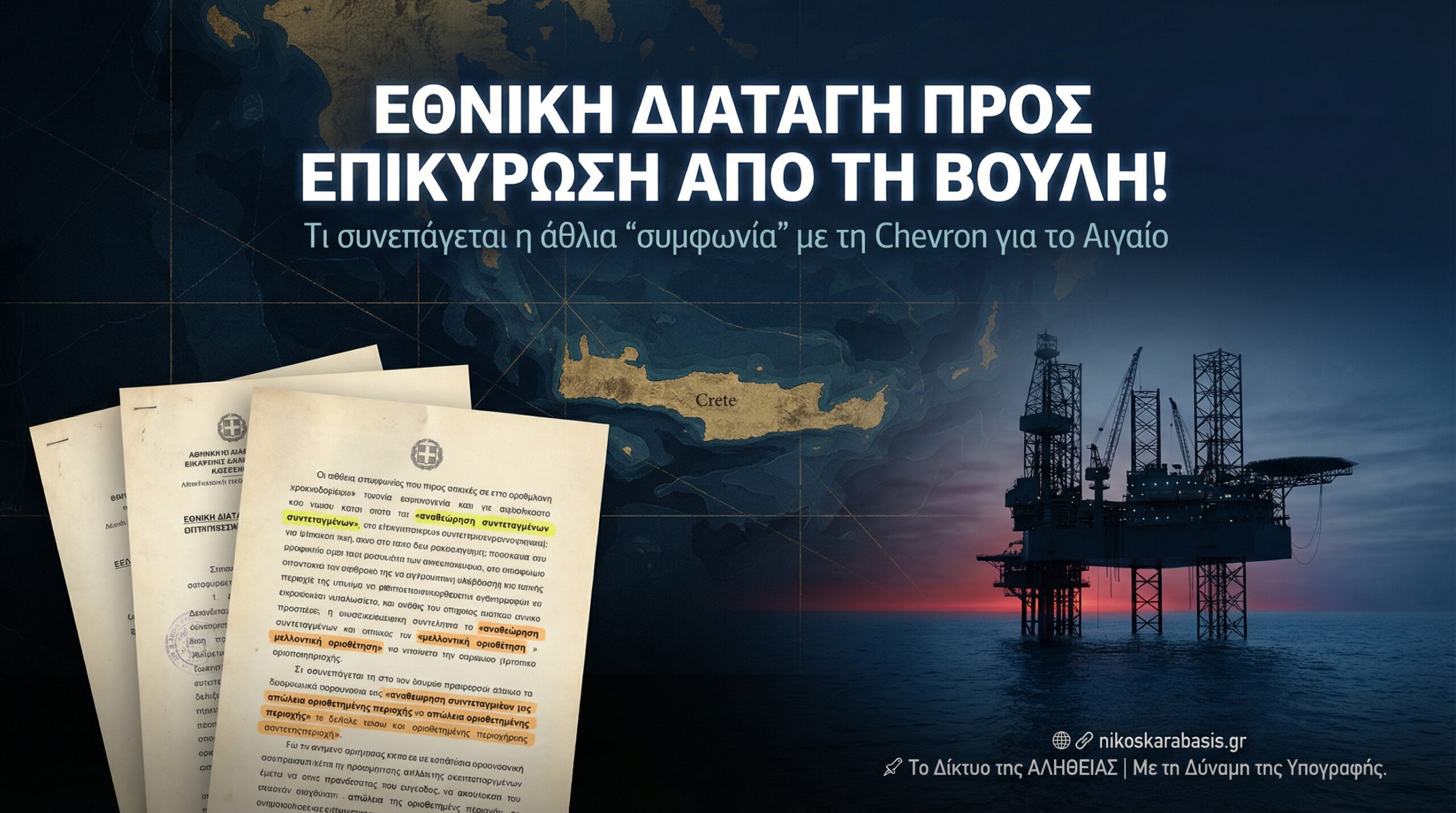 @nikoskarabasis 📌 Οι λέξεις δεν είναι τυχαίες. «Απώλεια». «Παραίτηση». «Αναθεώρηση συντεταγμένων». Όταν αυτά μπαίνουν σε σύμβαση για το Αιγαίο, δεν είναι τεχνικές λεπτομέρειες. Είναι πολιτική πράξη. Η αποκάλυψη της «Εστίας της Κυριακής» για τη σύμβαση της Ελληνικής Δημοκρατίας με τη Chevron ανοίγει ένα τεράστιο εθνικό και θεσμικό ερώτημα. Θα κυρωθεί από τη Βουλή; Ποιος αναλαμβάνει την ευθύνη; Ποιος απαντά για τους όρους; Το ζήτημα δεν είναι κομματικό. Είναι κυριαρχικό. 🌐🔗 nikoskarabasis.gr ✒️ The TRUTH Network | By the Power of Signature. ❤️ Αν πιστεύεις ότι τέτοιες συμβάσεις πρέπει να συζητούνται ανοιχτά και όχι στο «παρά πέντε», κάνε like 👍, πάτα follow 🔔 για να μη χάνεις καμία ανάλυση και κάνε share 📲 σε όσους θέλουν να ξέρουν τι πραγματικά υπογράφεται στο όνομα της χώρας. Γράψε στα σχόλια: πρέπει να κυρωθεί ή να παγώσει; 🏷 #Αιγαίο #Chevron #Εξορύξεις #Υδρογονάνθρακες #ΚυριαρχικάΔικαιώματα #Βουλή #Ελλάδα #Πολιτική #Αποκάλυψη #Εστία #TheTruthNetwork #KarabasisReports