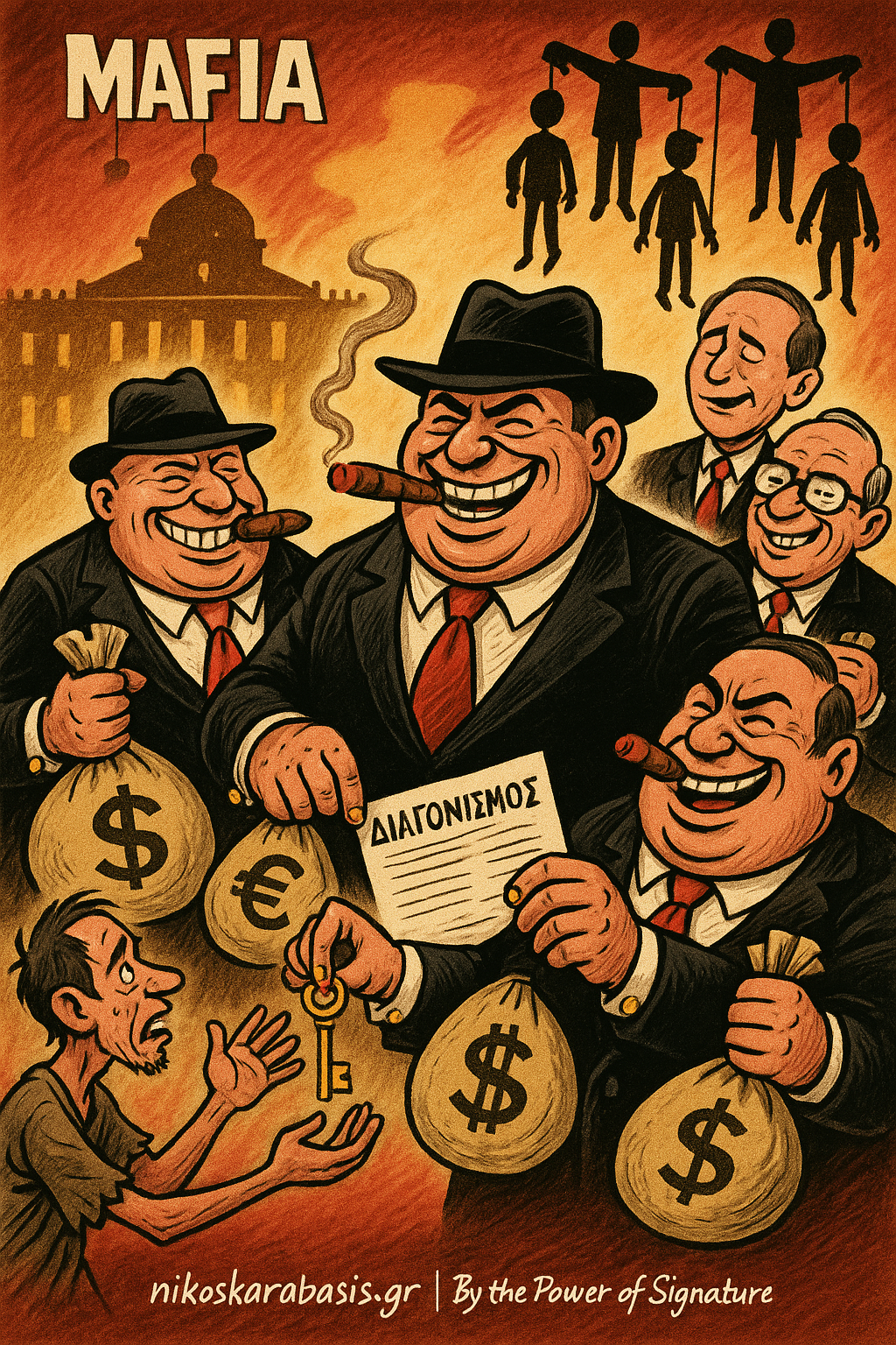 Στυλ: Σατιρικό, με καρικατουρίστικες υπερβολές στα πρόσωπα (τεράστια χαμόγελα, σφιχτά πούρα, χρυσά μανικετόκουμπα). Χρωματική παλέτα: Μαύρο – κόκκινο – χρυσό.