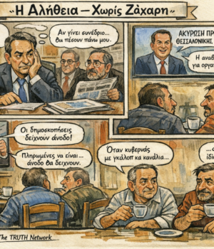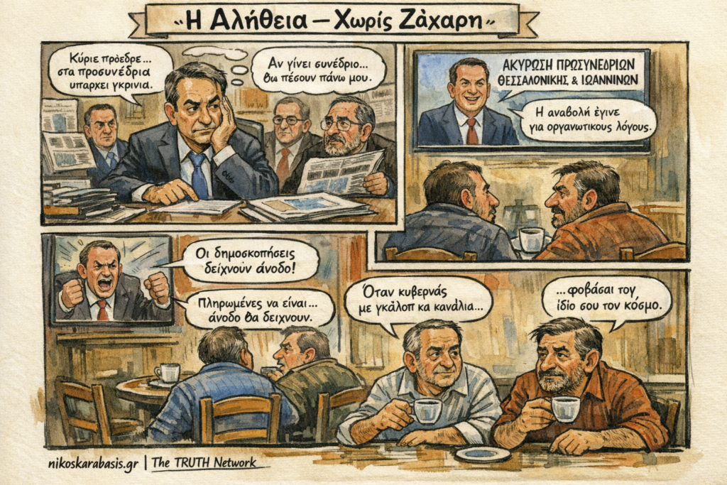 Το νέο επεισόδιο της σειράς «Η Αλήθεια – Χωρίς Ζάχαρη» σχολιάζει με σατιρικό αλλά δημοσιογραφικό τρόπο τη σχέση εξουσίας, δημοσκοπήσεων και πραγματικής κοινωνικής δυναμικής.