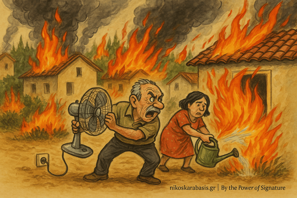 Η Ελλάδα καίγεται. Όχι απλώς μια φωτιά. Πύρινα μέτωπα παντού – Αχαΐα, Χίος, Πρέβεζα. Δάση, σπίτια, βιομηχανίες, περιουσίες. Ακόμα και Κέντρα Υγείας εκκενώνονται. Και η κυβέρνηση; Συμφιλιωμένη με την καταστροφή. Σαν να είναι… νέα κανονικότητα.