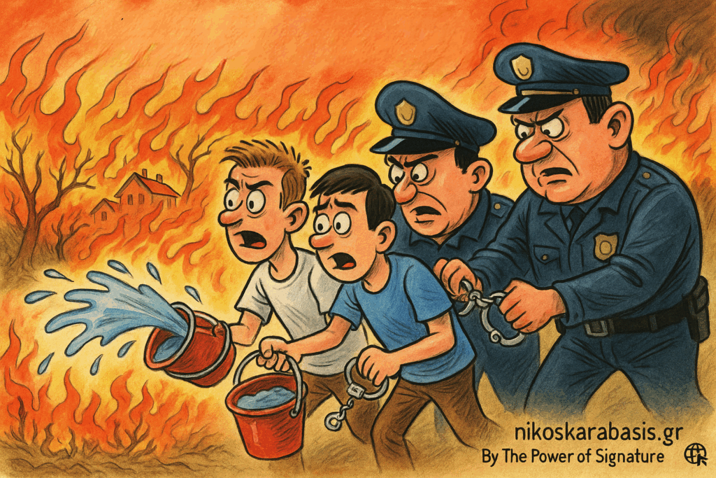 Στην κορυφή του σκίτσου, με μεγάλα γράμματα, η ειρωνική επιγραφή: «Πιάσαμε τους εμπρηστές».