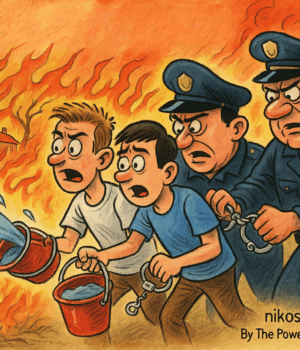 Αστυνομικοί με υπερβολικά μεγάλα κεφάλια και αυστηρό ύφος τους περνούν χειροπέδες, ενώ γύρω τους το δάσος συνεχίζει να καίγεται.