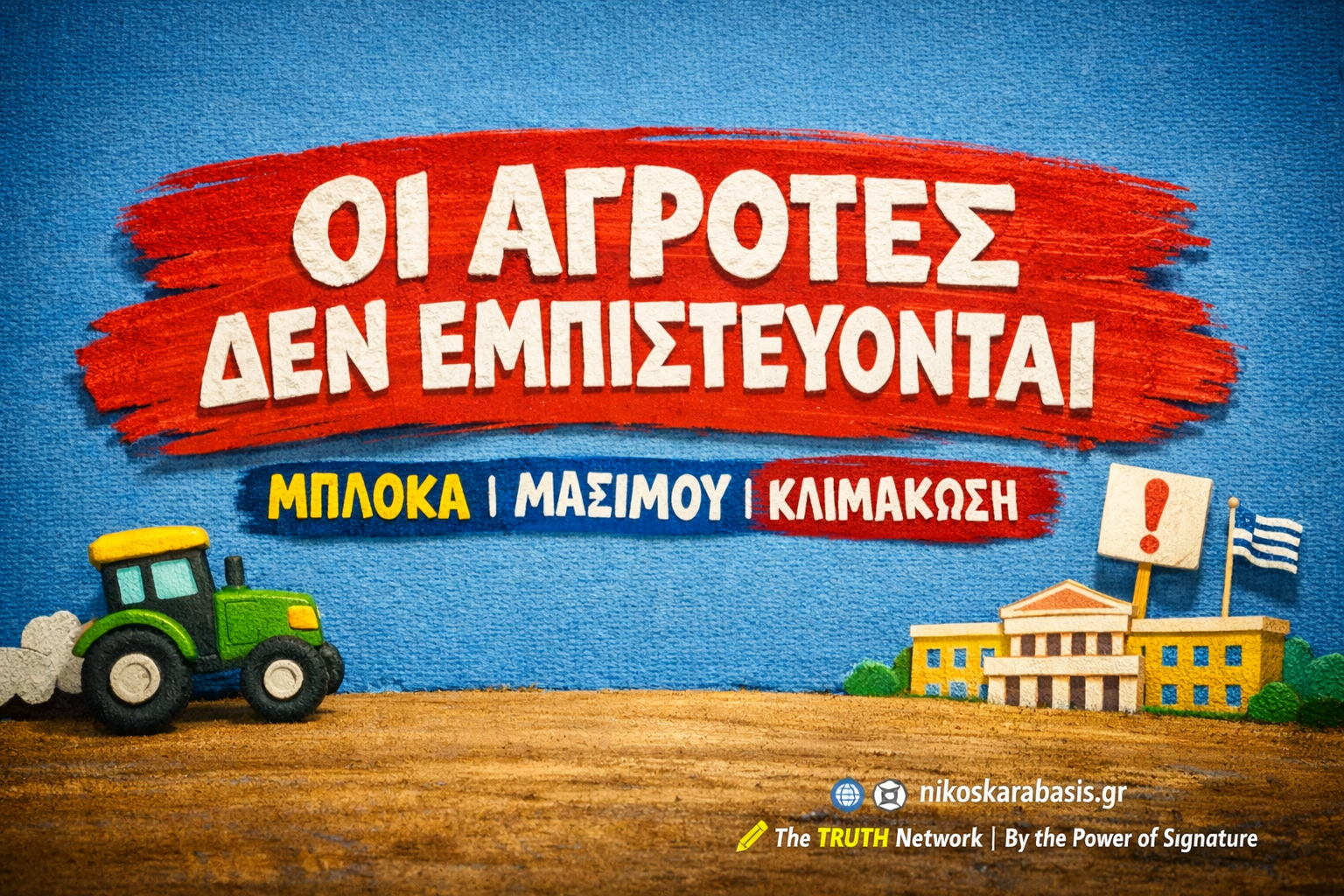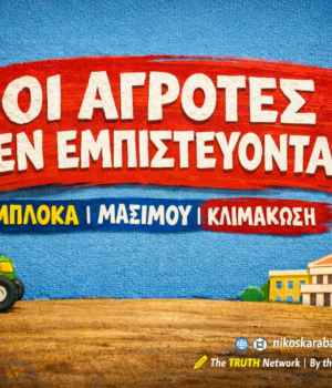 Αν η συζήτηση δεν τους ικανοποιήσει; Τίποτα δεν τελειώνει. Τότε όλα αρχίζουν. Blackout της χώρας. Πανελλαδικό συλλαλητήριο. Τρακτέρ στο Σύνταγμα. Αποκλεισμός της Αθήνας. Όχι για εντυπώσεις. Για επιβίωση. Το μήνυμα είναι καθαρό: Όλοι στα Μπλόκα. Δεν υποχωρούμε. Κλιμακώνουμε. Ενωμένοι θα νικήσουμε.