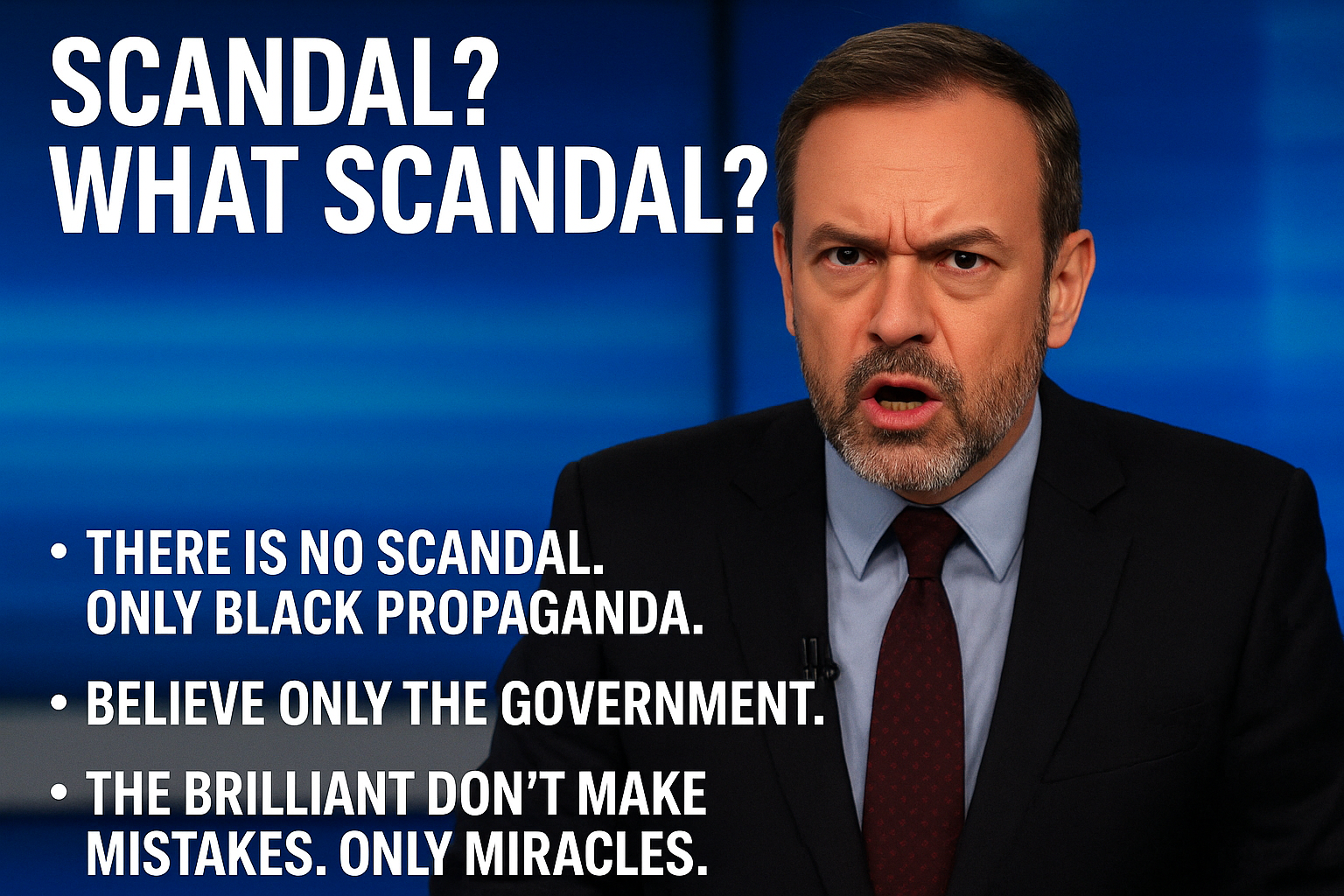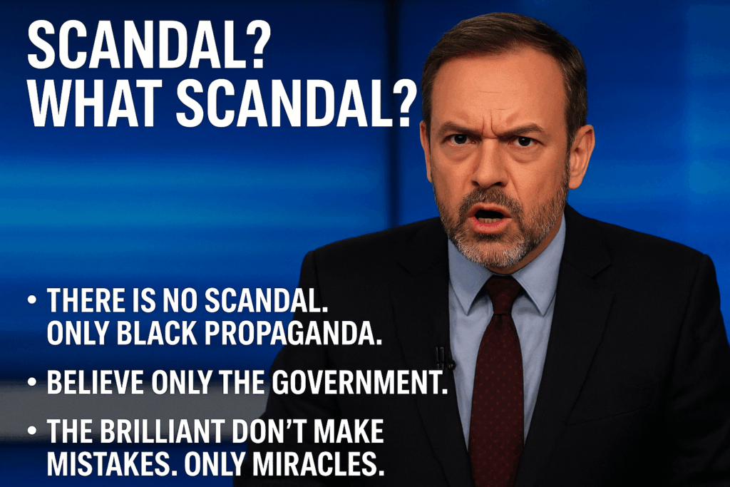 Και για όποιον ψιθυρίζει τα αντίθετα, ας θυμηθούμε τη σοφή κουβέντα του Σημίτη: «Όποιος έχει στοιχεία να τα πάει στον εισαγγελέα». Δηλαδή στον Έλληνα εισαγγελέα — όχι σε κάναν Ευρωπαίο, γιατί εκεί μπλέξαμε. Γιατί οι Ευρωπαίοι εισαγγελείς, τι αφέλεια, δεν ξέρουν ότι στην Ελλάδα τα σκάνδαλα είναι αποκυήματα φαντασίας.
