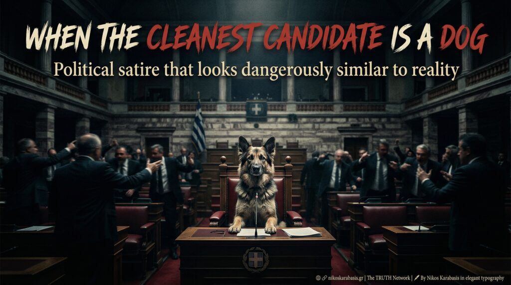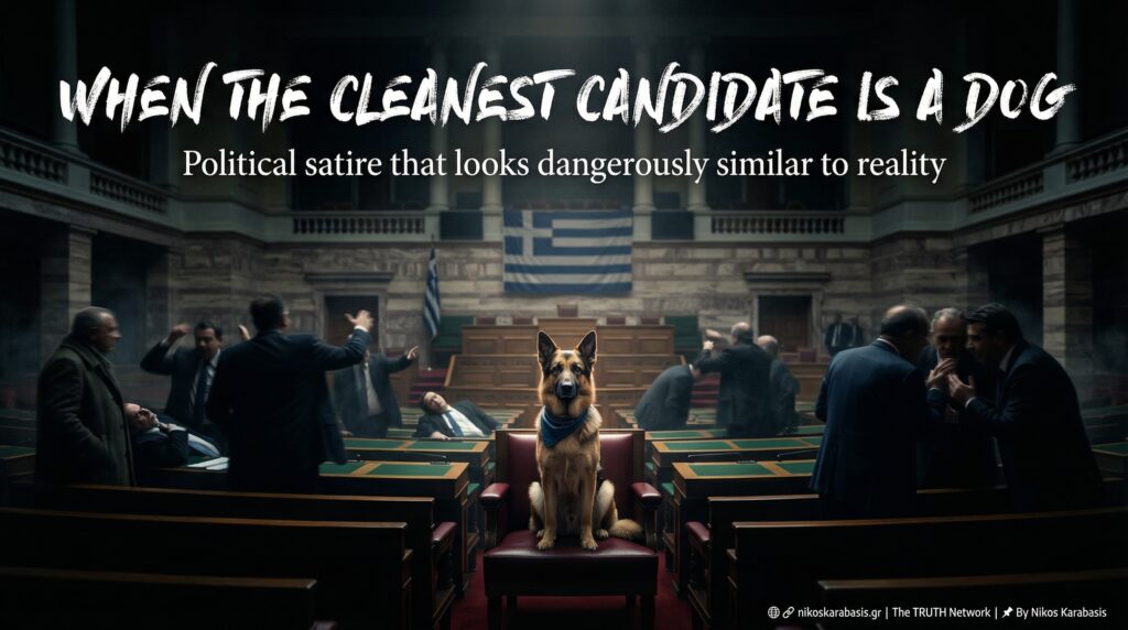 Η ιστορία του “Φυστίκη”, ενός σκύλου που αναδεικνύεται σε υποψήφιο ως ο μόνος «αμόλυντος», δεν είναι απλώς ένα ευφυές σατιρικό εύρημα. Είναι ένας καθρέφτης.