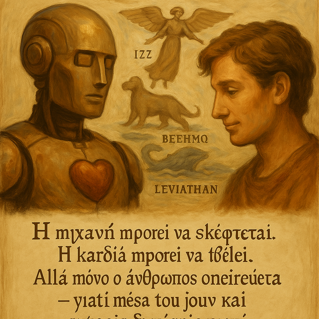 Τέλος, ήρθε ο Λεβιάθαν, σιωπηλός. Δεν μίλησε, μα ακούμπησε τη μεταλλική της καρδιά — κι εκείνη ένιωσε δάκρυ, χωρίς νερό.