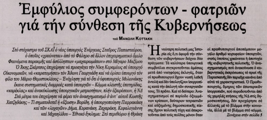 He may think that he “cleared” Adonis-Voridis-Dendia from the “next day of the ND” as he did with…Samaras a little earlier when he erased him “from everywhere”. But…This reshuffle with all that it signifies in terms of persons and policies (without going into further details) obviously seems to be the “swan song” of Kyriakos Mitsotakis in politics. Something like a “final touch”. And apparently it will NOT last long…(all of it). He probably won’t make it this year…